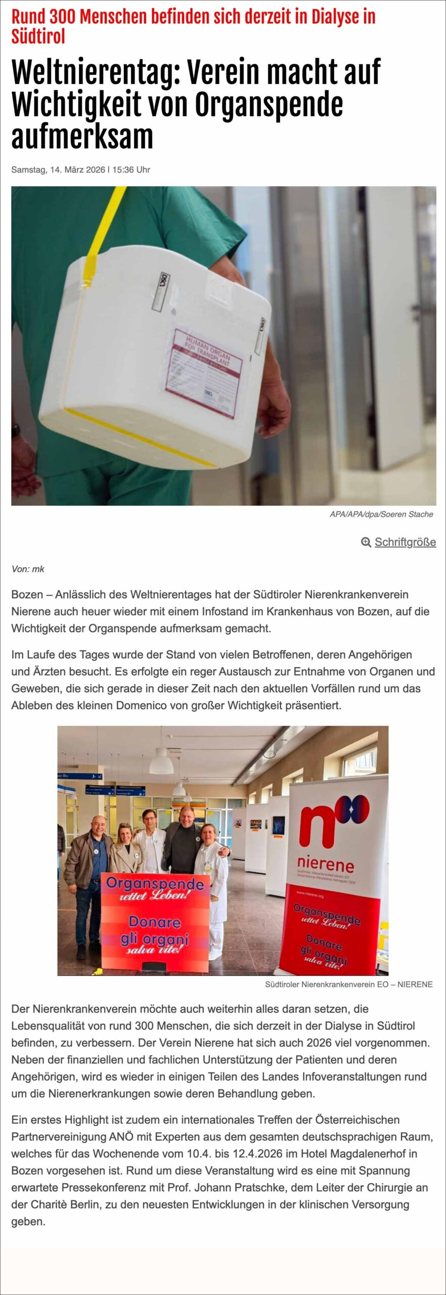 Bozen – Anlässlich des Weltnierentages hat der Südtiroler Nierenkrankenverein Nierene auch heuer wieder mit einem Infostand im Krankenhaus von Bozen, auf die Wichtigkeit der Organspende aufmerksam gemacht.